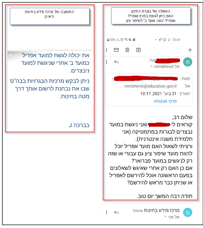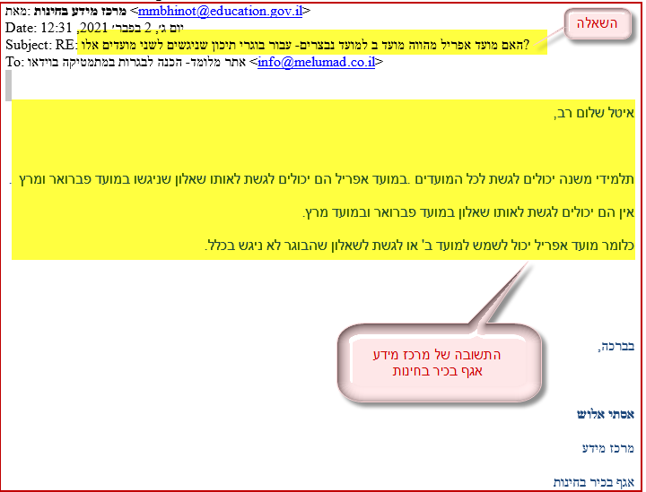להלן תשובת מרכז מידע בחינות, שניתנה לתלמידה שלנו, על מועד אפריל כמועד ב, עבור מרץ לבוגרי תיכון: